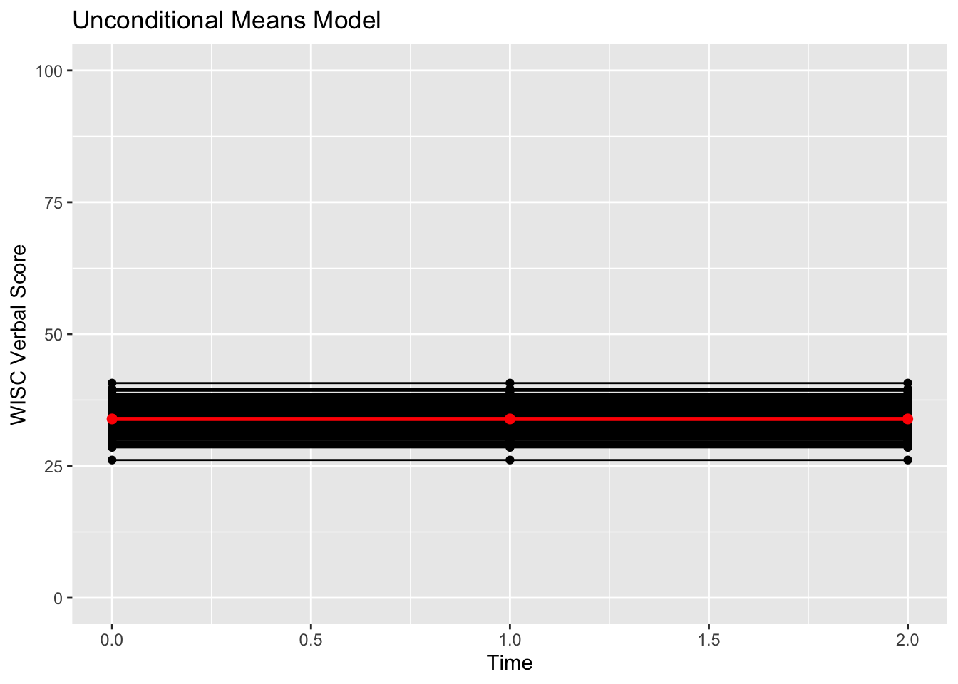 Note, in the unconditional means model there is no-growth, each individual has an intercept, but no change in scores is predicted because there are no predictors (e.g. time) in the level-1 equation.