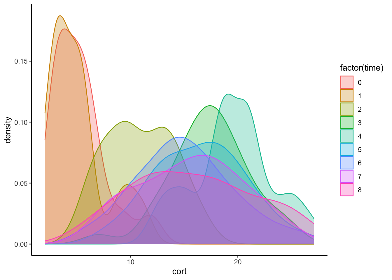geom_density(aes(group=factor(time), colour=factor(time), fill=factor(time)), alpha=0.3) +