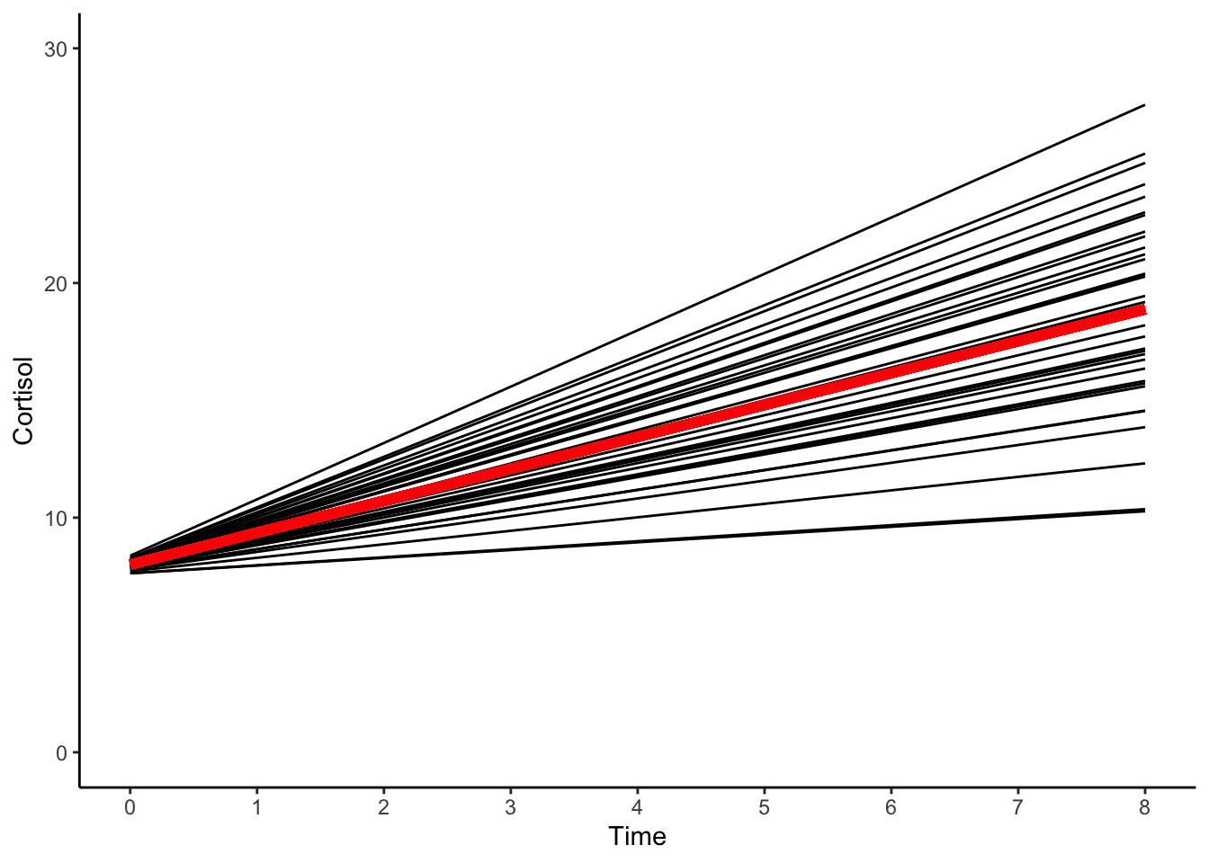- \(\beta_{1i}\) is the expected total change in cortisol for individual \(i\)
