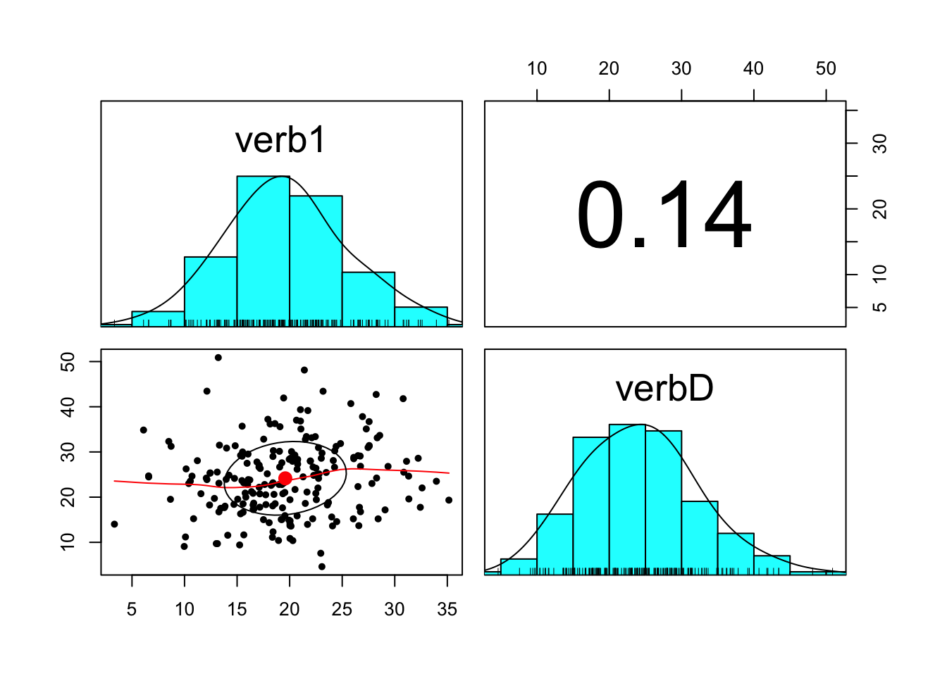 psych::pairs.panels(wiscsub[,c("verb1","verbD")])