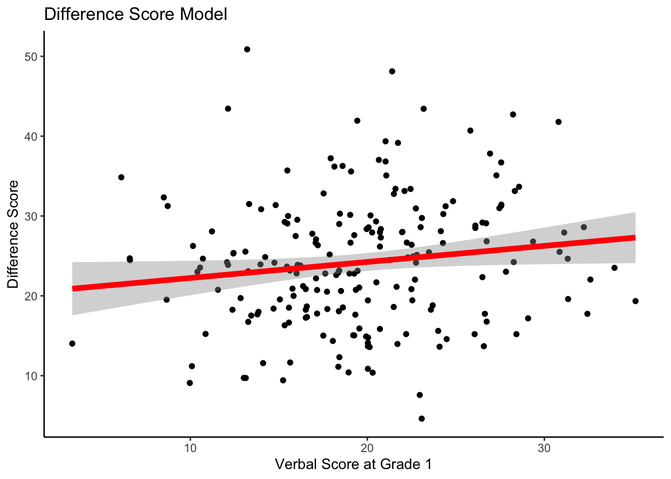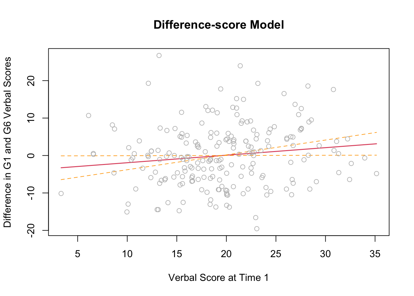 The intercept term, \(\beta_{0} = 20.22\) is the expected value of the difference score (raw change in verbal ability), for an individual with a verbal ability score = 0 at the first occasion.